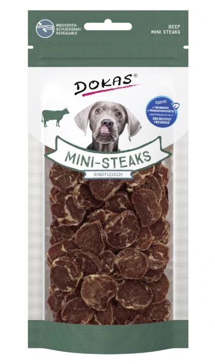 Stejně jako všechny pamlsky Dokas, i Mini steaky jsou přírodní, neobsahují konzervační látky, umělá barviva či dochucovadla. Jejich výroba podléhá pravidelným kontrolám ze strany nezávislé laboratoře SGS Institut Fresenius, která prověřuje kvalitu použitých surovin i samotný průběh výrobního procesu.