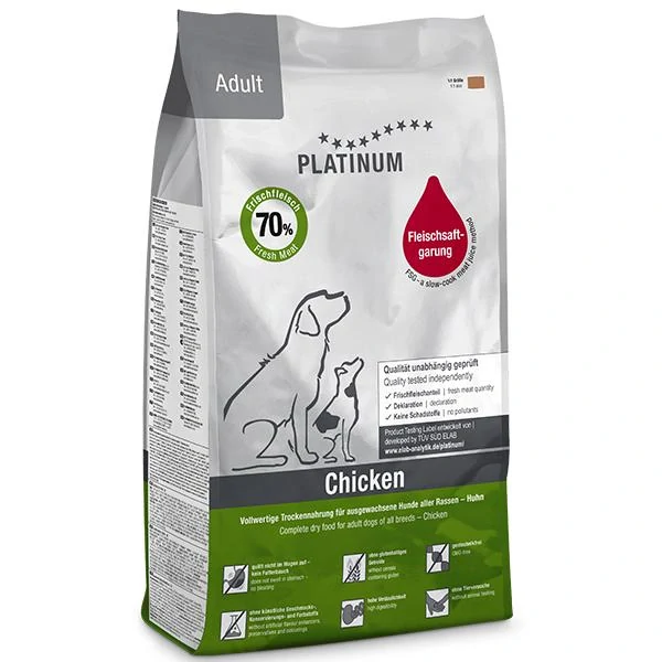 Platinum Natural Adult Chicken je přírodní krmivo pro dospělé psy všech plemen. Je obohaceno hodnotnými oleji, výtažky z bylinek, rýží, zeleninou, vitaminy (i vitaminem K1) a stopovými prvky. Žádná z ingrediencí není geneticky upravována a získává se ze svého přirozeného prostředí. Granule jsou drobné a poloměkké, vhodné pro všechna plemena psů.